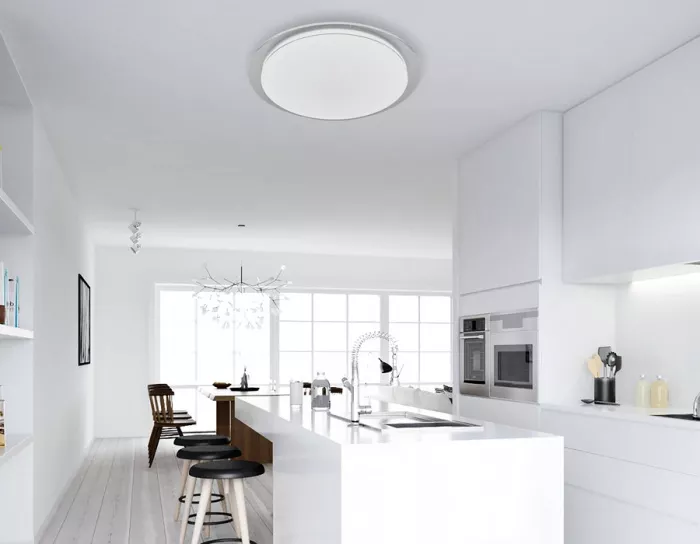 Круглый плафон создает равномерное приятное освещение. Он имеет цветовую температуру 3000-6400 К, что прекрасно подойдет для прихожей и коридора, спальни, кухни и гостиной. Высота светильника составляет 7 см, а диаметр — 45 см, что делает его хорошим выбором для помещений любых параметров.